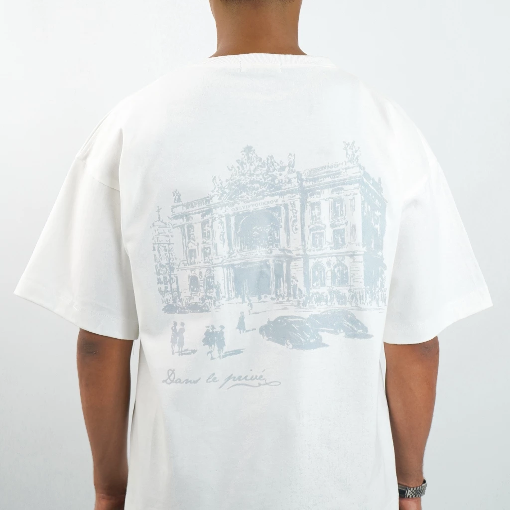 The front features a minimal signature mark, while the back carries a European architecture graphic print, creating a clean balance between simplicity and statement design.